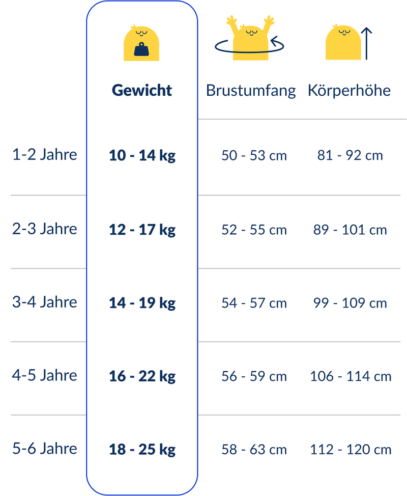Ja, der technische Teil, der sich aufblasen lässt, folgt dem Wachstum des Kindes (gültig von 10 kg bis 30 kg). Vollständig vom Textilteil trennbar, Sie brauchen nur das T-Shirt allein zu wechseln, wenn das Kind wächst (siehe E-Shop). Nur die Nachfüllpackung (Gaspatrone + Wassersensor) ist für den einmaligen Gebrauch bestimmt.